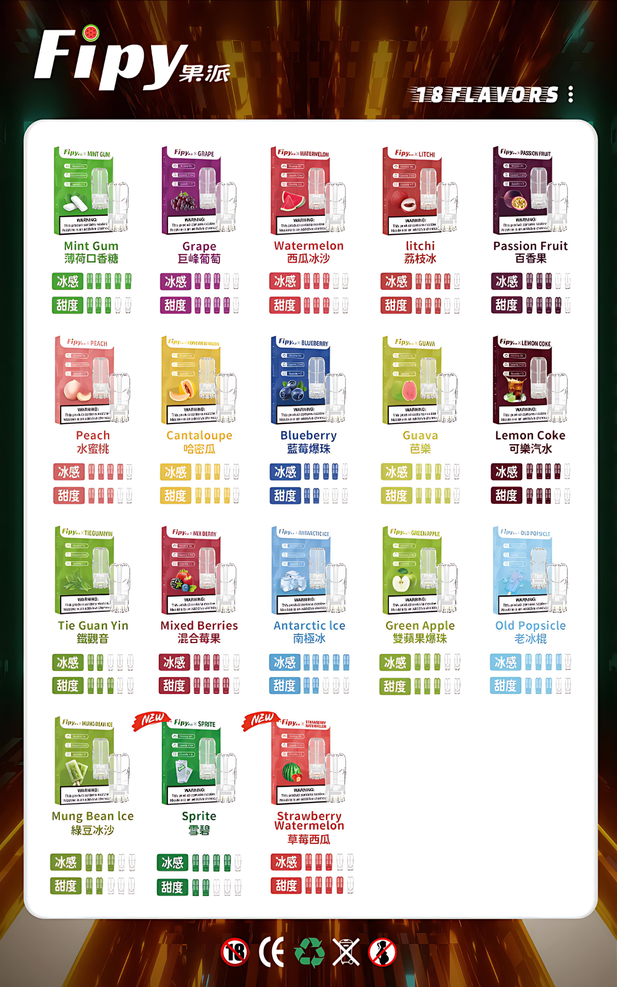 Fipy 果派煙彈是一款3%尼古丁鹽濃度、2.2ml容量的通用型霧化彈,專為 RELX 一代、星座主機、SP2S 、EVO等主機設計。採用高穩定性陶瓷霧化芯,有效避免漏油與焦味。