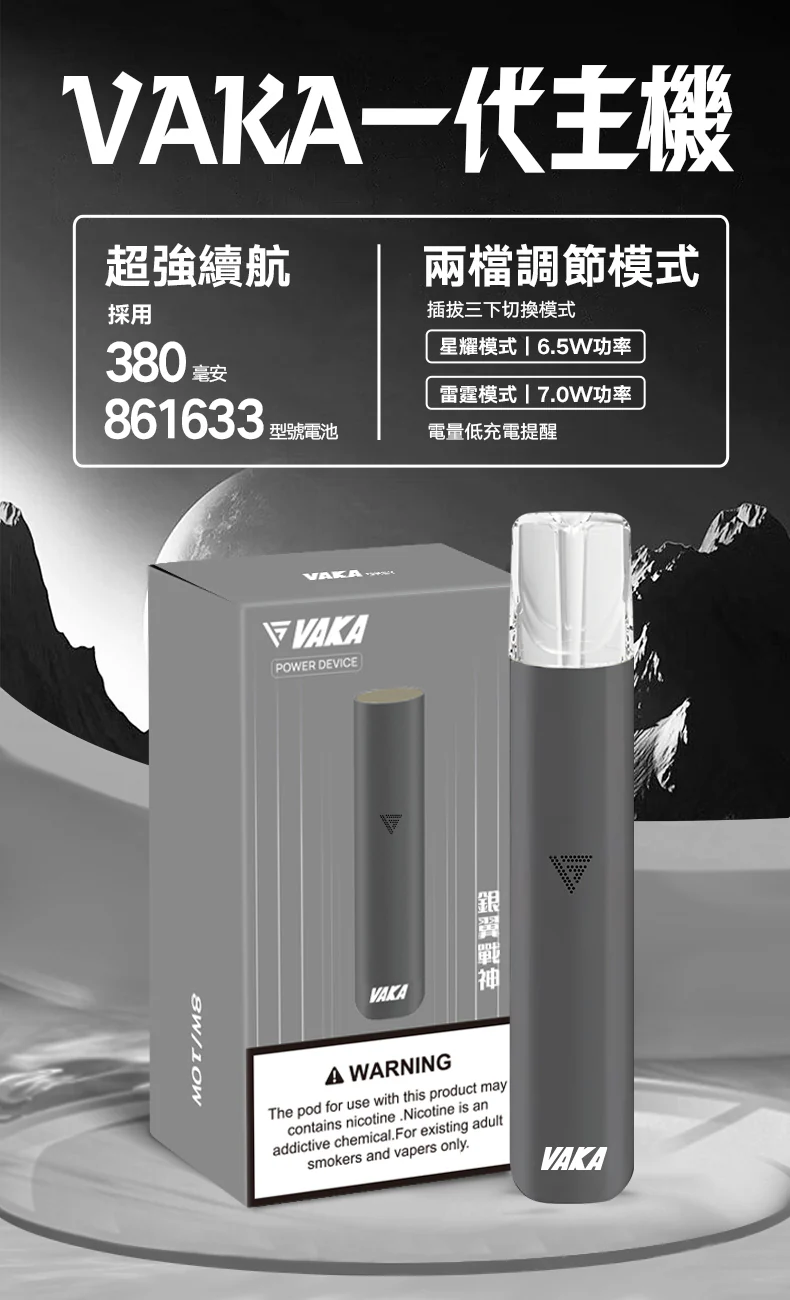 VAKA 主機是一款兼具高通用性、穩定霧化輸出與時尚外型的全能型電子煙設備,專為使用一代煙彈的用戶量身打造。