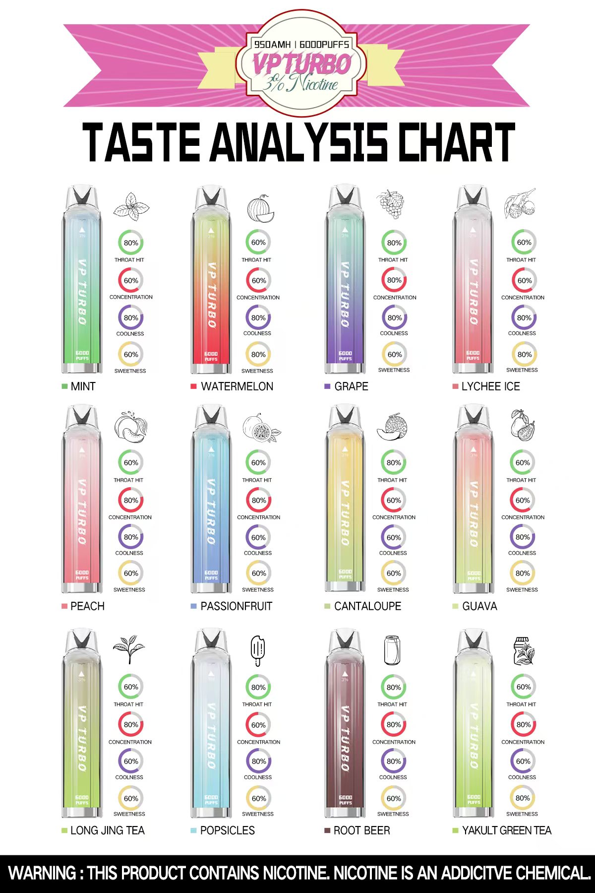 • 豐富口味:VP Turbo 6000提供多種口味選擇,包括荔枝、百香果、老冰棍、蜜桃、薄荷等,滿足不同用戶的口味偏好。